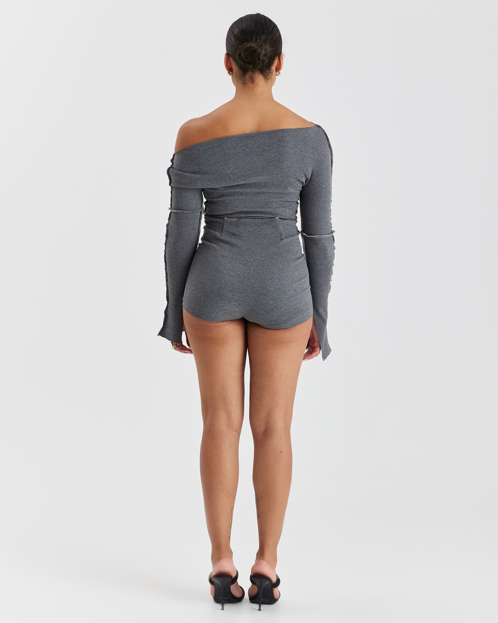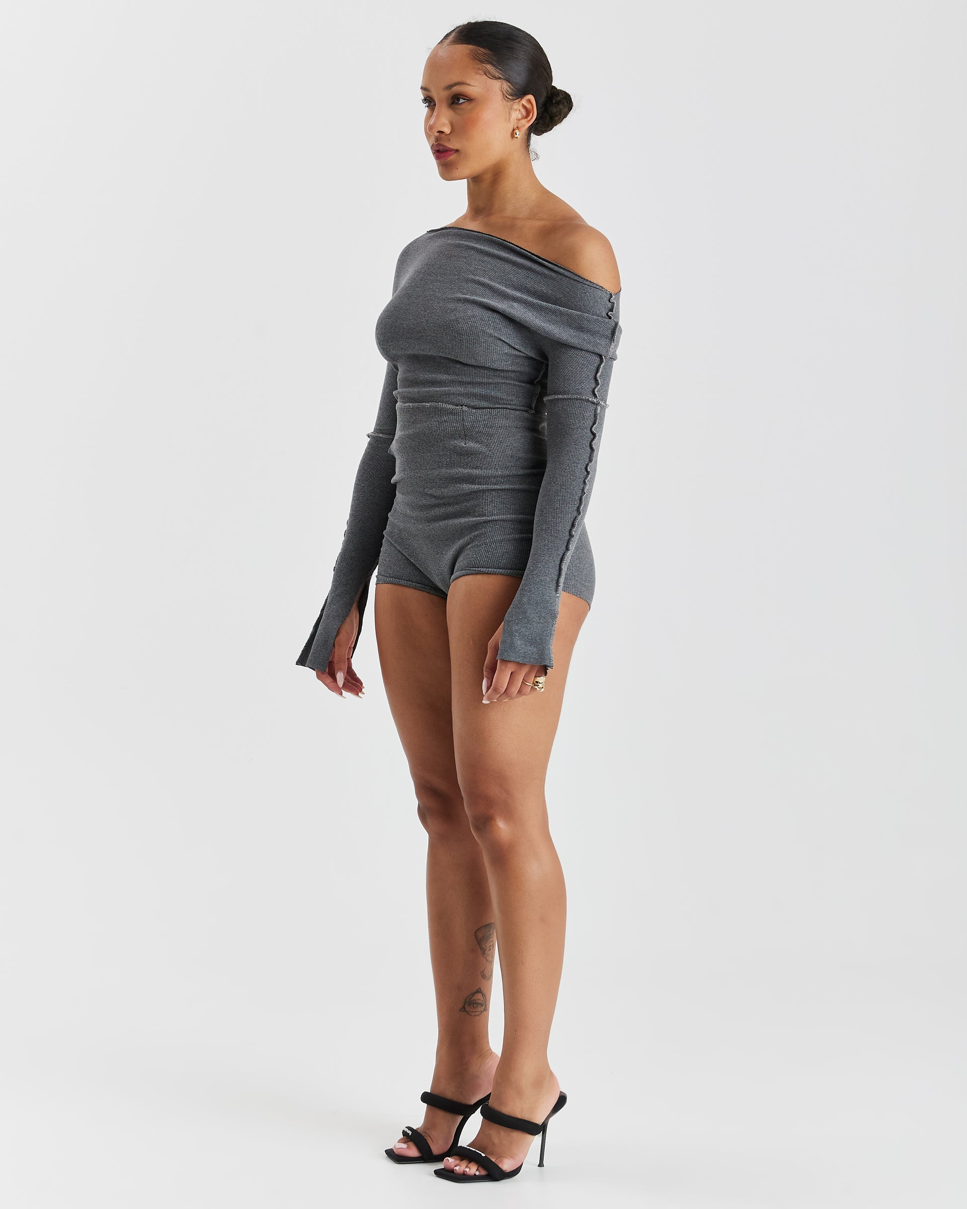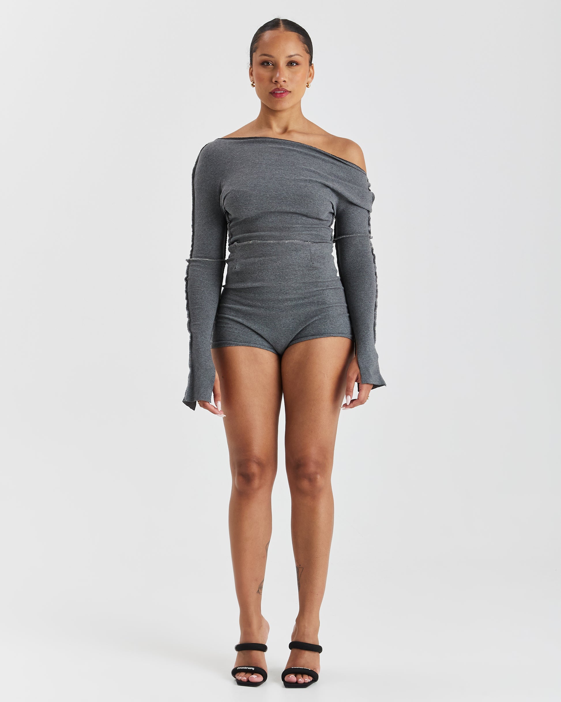 Introducing the Maui mini short set in a dark Glacier grey, perfect for Autumn/Winter layering. This stylish ensemble features a cozy off the shoulder top with seam detailing and matching high-waisted shorts, crafted from soft, warm fabric to keep you comfortable during cooler days. Pair it with tights or layer under an oversized jacket for a versatile look that effortlessly blends comfort and style. Embrace the season with the Maui set, a must-have addition to your winter wardrobe.